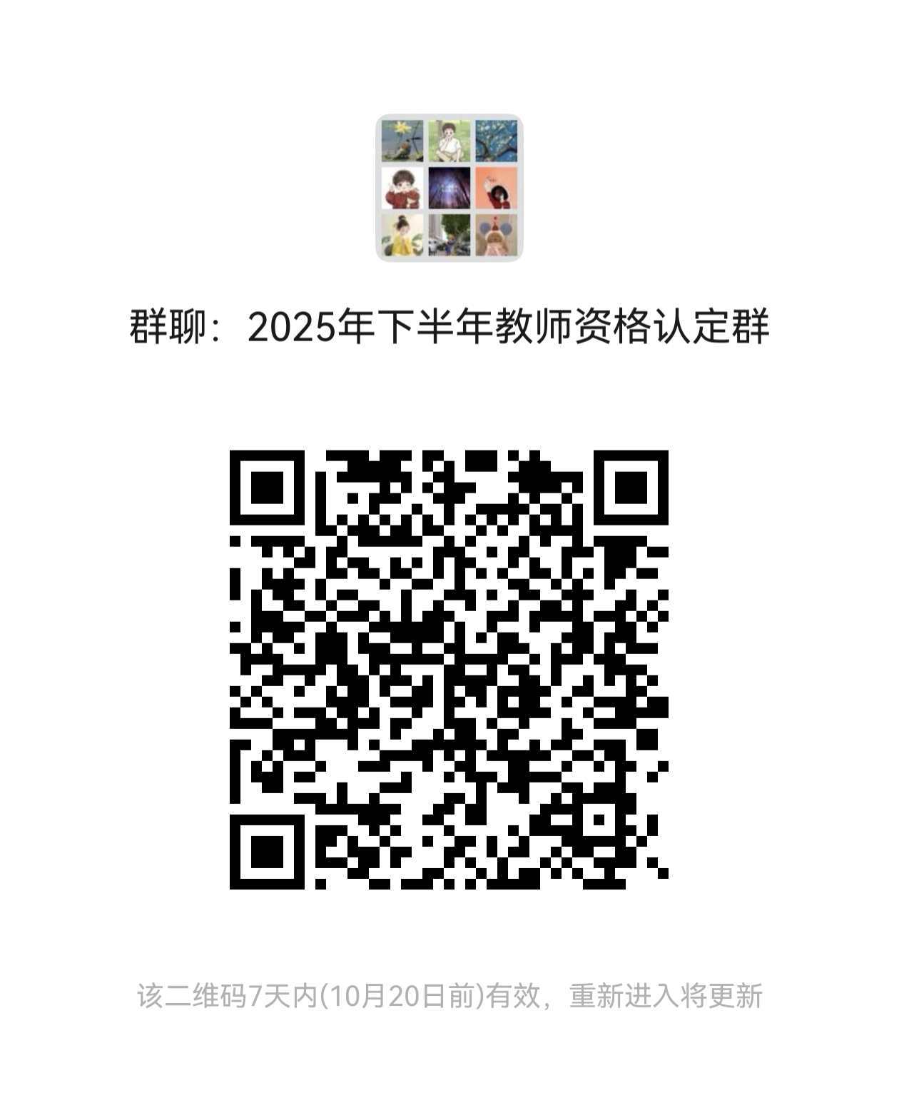(二)各单位要及时做好宣传,将网报、体检、现场提交材料、审核材料时间通知本单位拟参加本次认定的人员,确保本次认定工作顺利进行。请各单位联络员及时通知本部门参加本次认定的相关老师于10月20日(周一)前加入学校2025年下半年教师资格认定群(具体通过扫码下方二维码进群)。